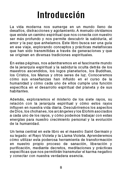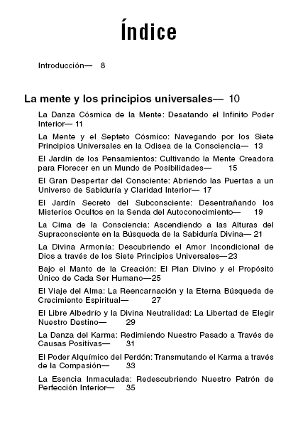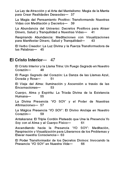 A lo largo de sus páginas encontrarás reflexiones profundas sobre la mente consciente, subconsciente y supraconsciente; los siete principios universales; el poder de los pensamientos y decretos; el despertar del Cristo Interior y la Llama Trina; la conexión con la Presencia YO SOY; y la guía de los Maestros Ascendidos y la Llama Violeta como herramientas de sanación y transmutación.