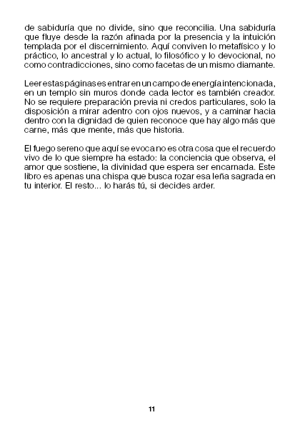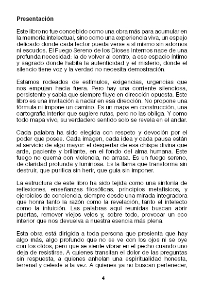 El Fuego Sereno de los Dioses Internos es una obra filosófica y espiritual que invita a una experiencia transformadora más allá de la simple lectura. Cada página abre un espacio de introspección donde la palabra se convierte en chispa y el silencio en maestro.