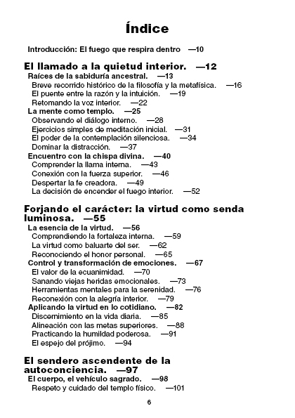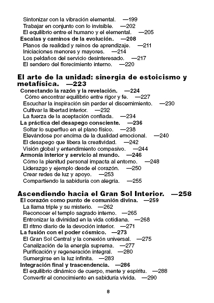 Este libro integra filosofía, metafísica y prácticas de autoconciencia, ofreciendo un mapa interior hacia la quietud, el despertar de la chispa divina y la expansión de la consciencia. Sus capítulos recorren temas como el poder del pensamiento, la virtud como senda luminosa, la fuerza de la palabra, los siete cuerpos y planos de existencia, y el arte del desapego consciente, todo acompañado de reflexiones profundas y ejercicios prácticos de introspección.