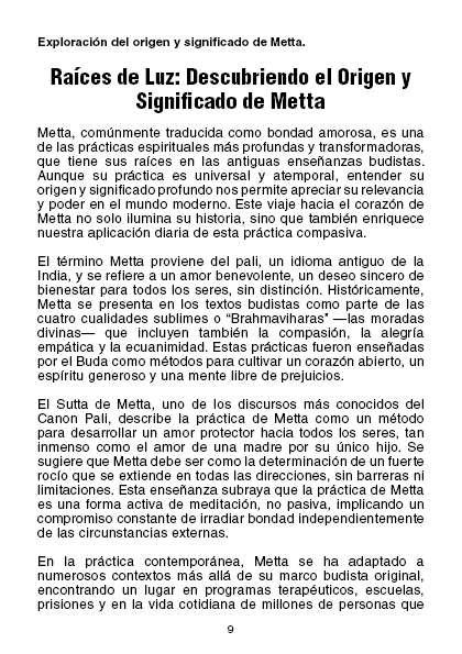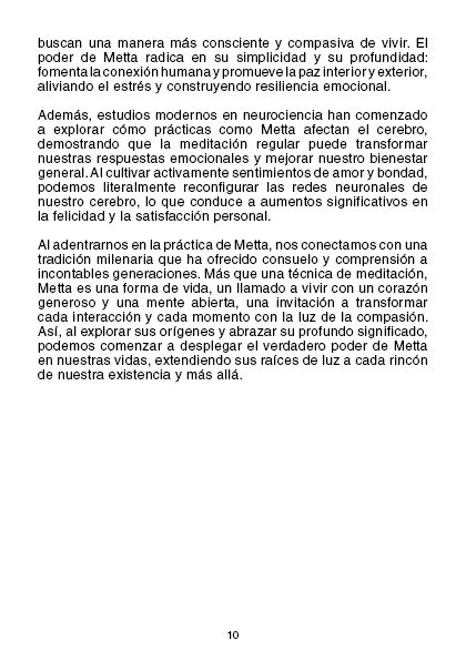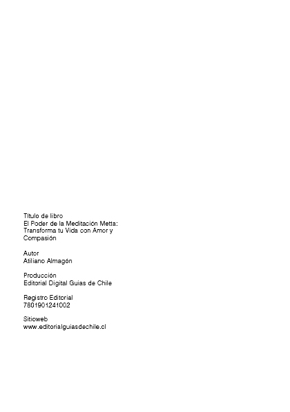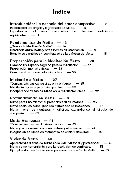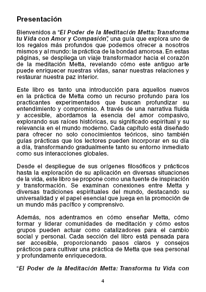 A lo largo de sus páginas, descubrirás cómo Metta puede enriquecer tus relaciones, mejorar tu bienestar emocional y ofrecerte una perspectiva más compasiva en la vida. Con meditaciones guiadas, técnicas de respiración, y consejos prácticos, esta guía está diseñada tanto para principiantes como para aquellos que desean profundizar en su práctica espiritual.