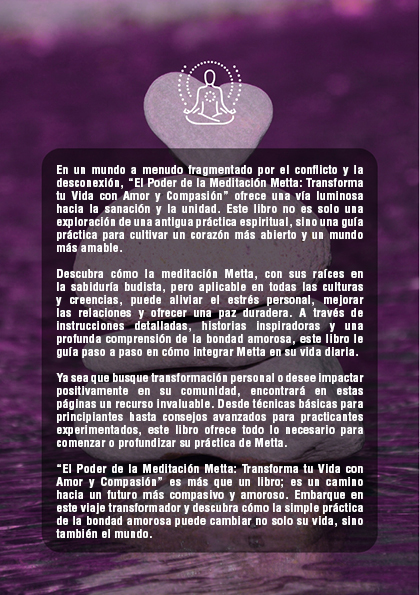 Sumérgete en El Poder de la Meditación Metta: Transformación Personal con Amor y Compasión, una guía que te llevará a explorar uno de los aspectos más profundos de la espiritualidad: la práctica de la bondad amorosa, conocida como Metta. Este libro es una invitación a transformar tu vida desde la raíz, cultivando amor y compasión hacia ti mismo y hacia todos los seres que te rodean.