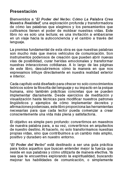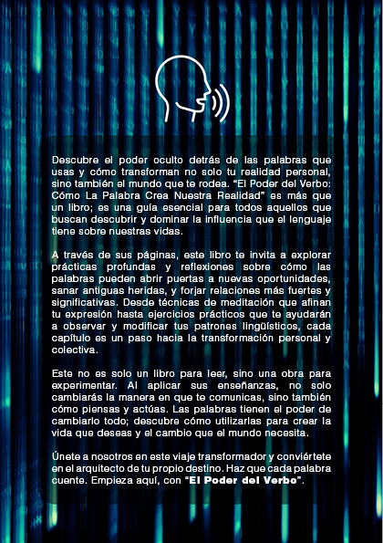 Sumérgete en un viaje transformador con «El Poder del Verbo: Cómo La Palabra Crea Nuestra Realidad«. Este libro es una guía profunda que explora cómo las palabras que elegimos y los pensamientos que cultivamos tienen la capacidad de moldear nuestras vidas. A lo largo de sus páginas, descubrirás cómo la expresión verbal no solo comunica, sino que crea y transforma nuestra realidad interna y externa.