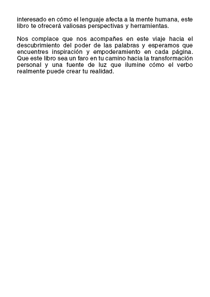 Este libro ofrece una mezcla de teoría y práctica, brindándote ejercicios concretos, como meditaciones, visualizaciones, y técnicas para modificar patrones lingüísticos. Aprenderás a implementar decretos y afirmaciones poderosas que te permitirán convertirte en el arquitecto de tu propio destino. Ideal para quienes buscan explorar la espiritualidad, mejorar sus habilidades de comunicación, o entender cómo el lenguaje afecta la mente humana.
