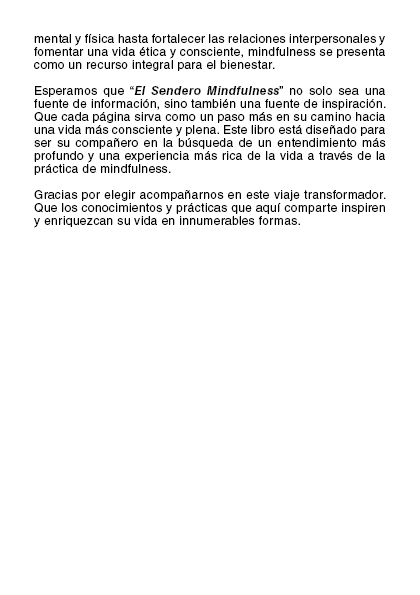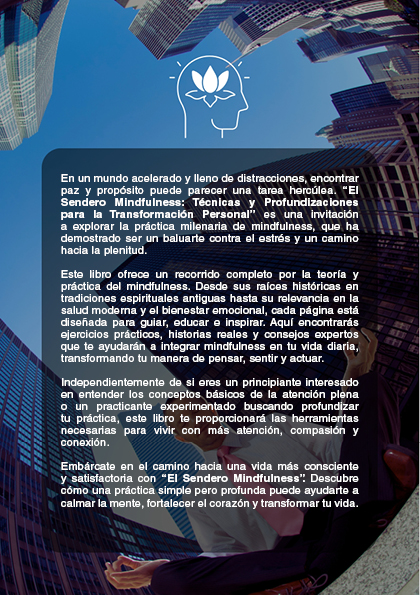En un mundo lleno de distracciones y estrés, El Sendero Mindfulness se presenta como un oasis de calma y claridad. A lo largo de sus páginas, explorarás desde los conceptos básicos de la atención plena y la meditación hasta técnicas avanzadas para la profundización de la consciencia y la conexión espiritual. Cada capítulo está diseñado para ser accesible tanto para principiantes como para aquellos que ya tienen experiencia en la práctica de mindfulness.