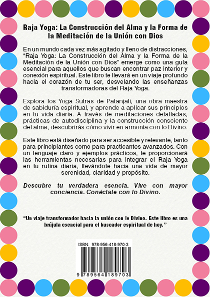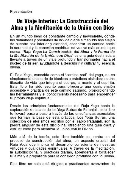 Raja Yoga: La Construcción del Alma y la Meditación de la Unión con Dios es una guía espiritual profunda que te invita a recorrer el “camino real” del yoga. A través de sus páginas descubrirás los fundamentos del Raja Yoga, la sabiduría de los Yoga Sutras de Patanjali, el proceso de construcción del alma y las prácticas que permiten alcanzar la unión con lo Divino.