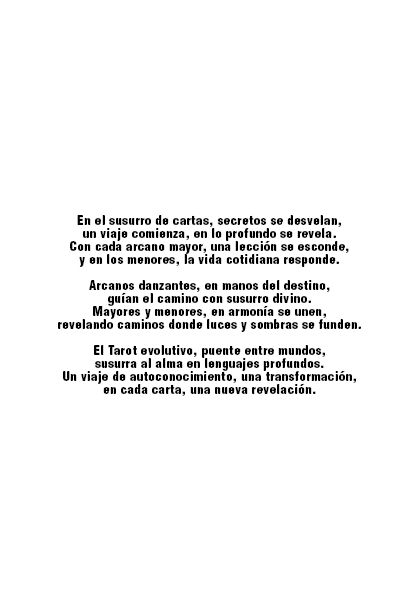 «Tarot Evolutivo» te ofrece una nueva perspectiva sobre la práctica del Tarot, enfocada en la introspección y el crecimiento personal. Con un enfoque claro y accesible, aprenderás a interpretar los arcanos no solo desde un punto de vista esotérico, sino también como herramientas para el desarrollo espiritual y la superación personal. Esta guía está diseñada tanto para principiantes como para tarotistas experimentados que buscan profundizar su conexión con el Tarot y aplicar sus enseñanzas en la vida diaria.